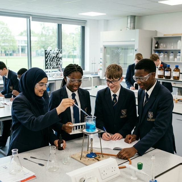 Secondary school students conducting a science experiment in a modern laboratory