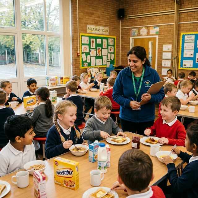 Typically run from 7:30 or 7:45am until the start of school. Children arrive, eat breakfast (toast, cereal, fruit), and have supervised free time or organised activities. Some breakfast clubs include homework help. The atmosphere is usually relaxed and informal. Many are run by the school itself; others by external providers like Camp Beaumont Kidz or local charities.